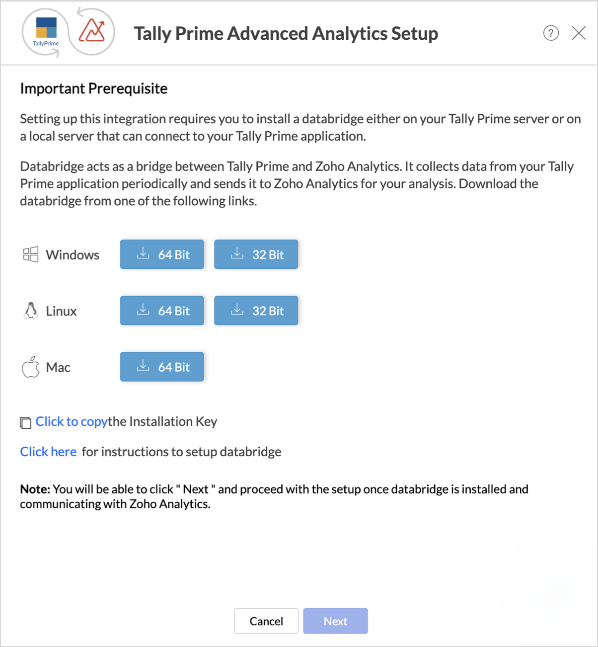 To set up this integration, you need to install a Databridge on either your TallyPrime server or a local server that can connect to TallyPrime. The Databridge acts as a link between TallyPrime and Zoho Analytics, periodically collecting data from TallyPrime and sending it to Zoho Analytics for analysis.
