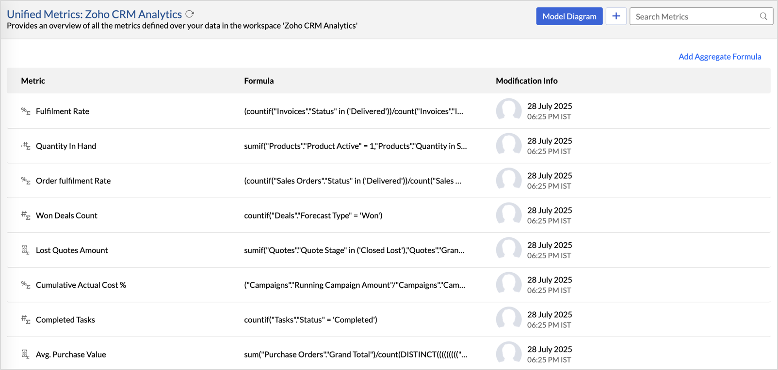 From the CRM workspace, click Data from the side panel and click Unified Metrics. This lists all the prebuilt formulas and other formulas available across the workspace.