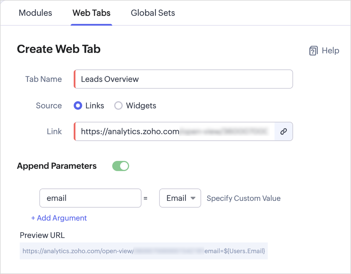 - Copy the generated URL and paste it into the Web Tab link field in Zoho CRM.