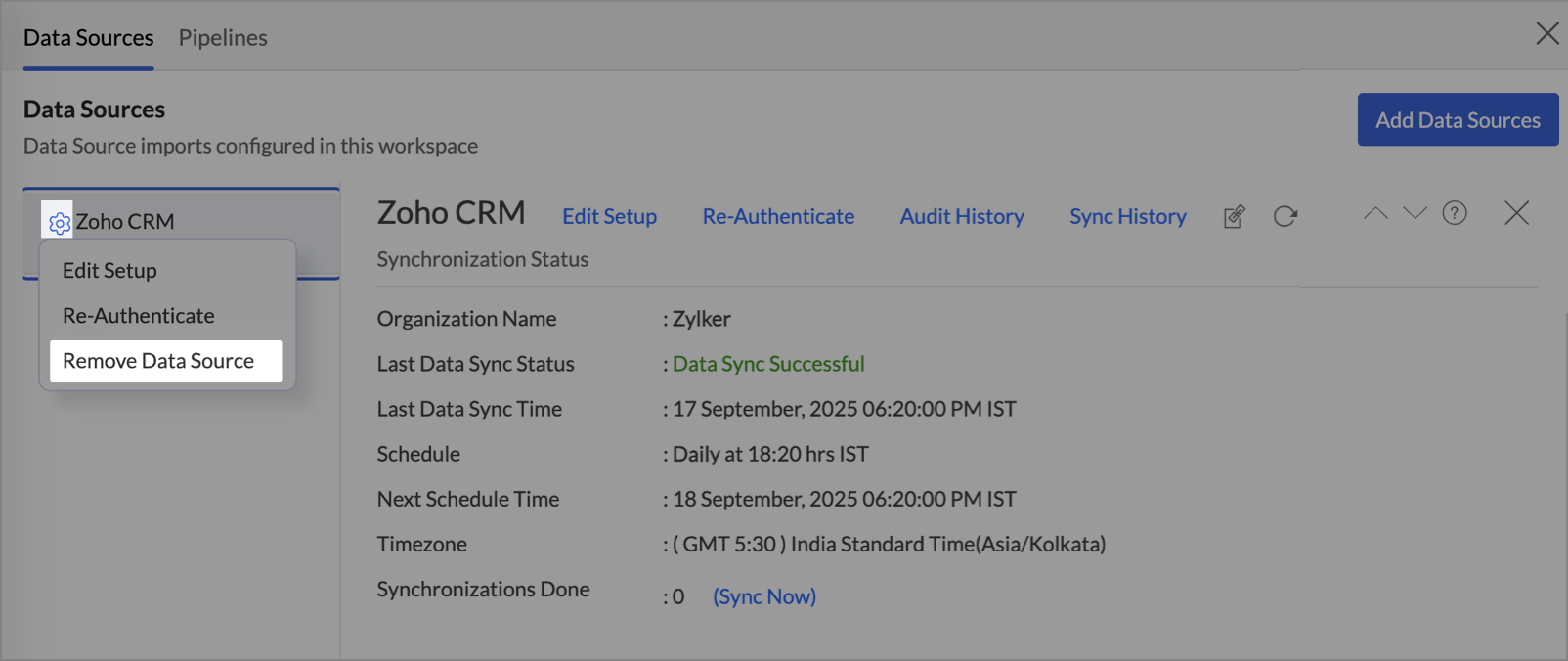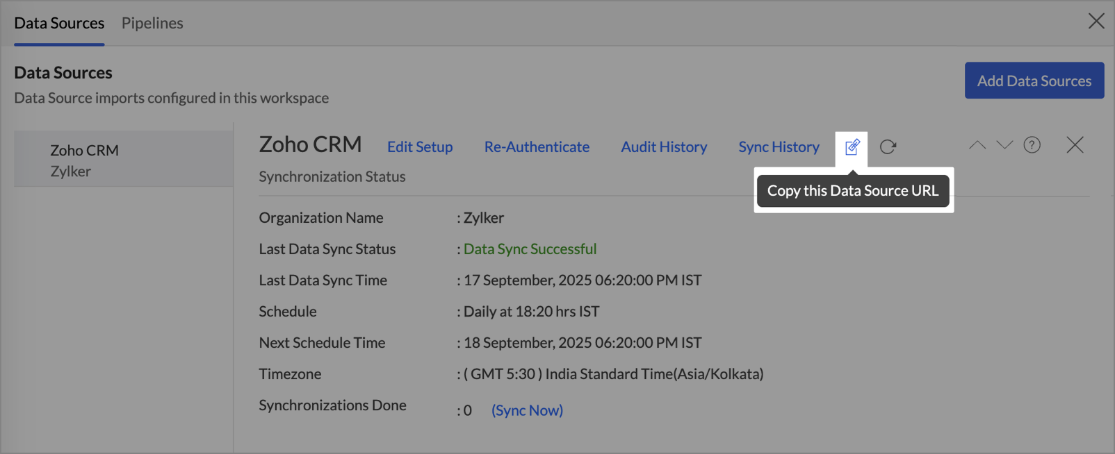 The Data Source Permalink helps you easily access the data source tab. Only the Organization Admin and Account Admin can make changes in the Data sources page. Other users can know the synchronization details like whether the last data sync was successful or not, when the last data sync happened, when the next sync is scheduled to happen, etc.