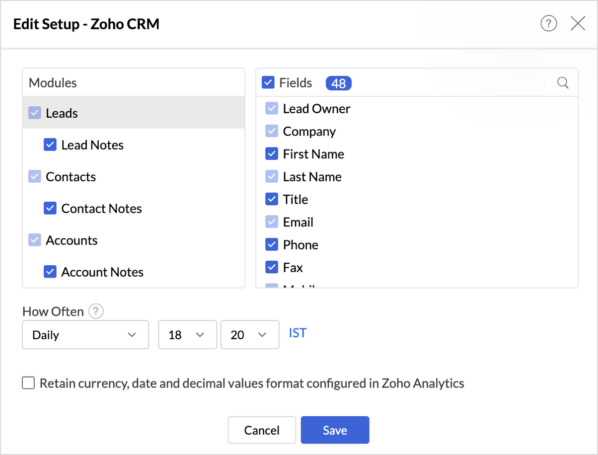 - If the Modules and Fields selected for analysis are deleted in Zoho CRM.