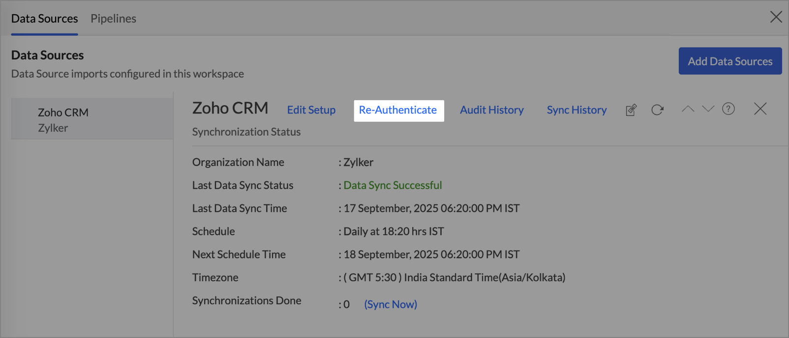- The Re-Authenticate Zoho CRM dialog will open. Click Authenticate Zoho CRM and enter the Zoho CRM credentials to re-authenticate.