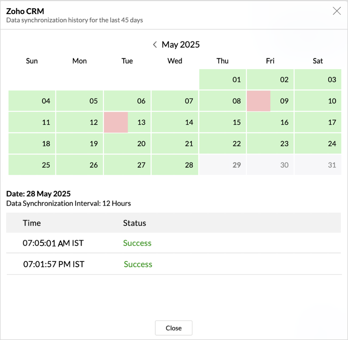- A calendar with the Sync History of the last 45 days will open. The date when the data sync has happened will be highlighted. Hover to view the number of times the data had got synced on a specific date.