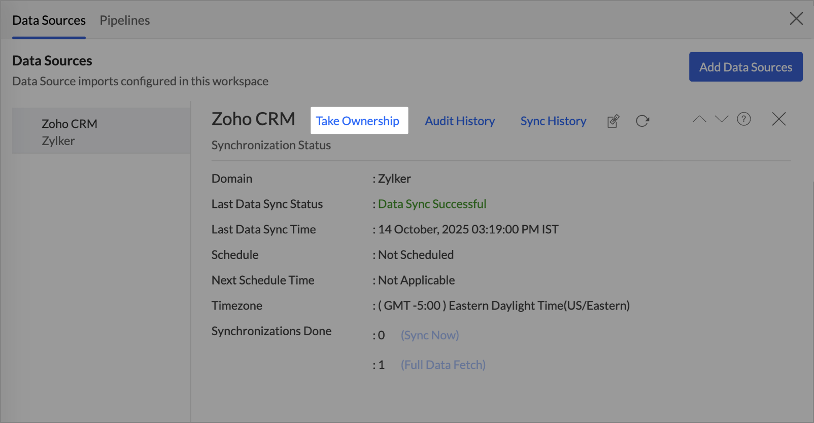 The Take Ownership option appears in the Data Sources page only after the previous owner is removed from the organization.