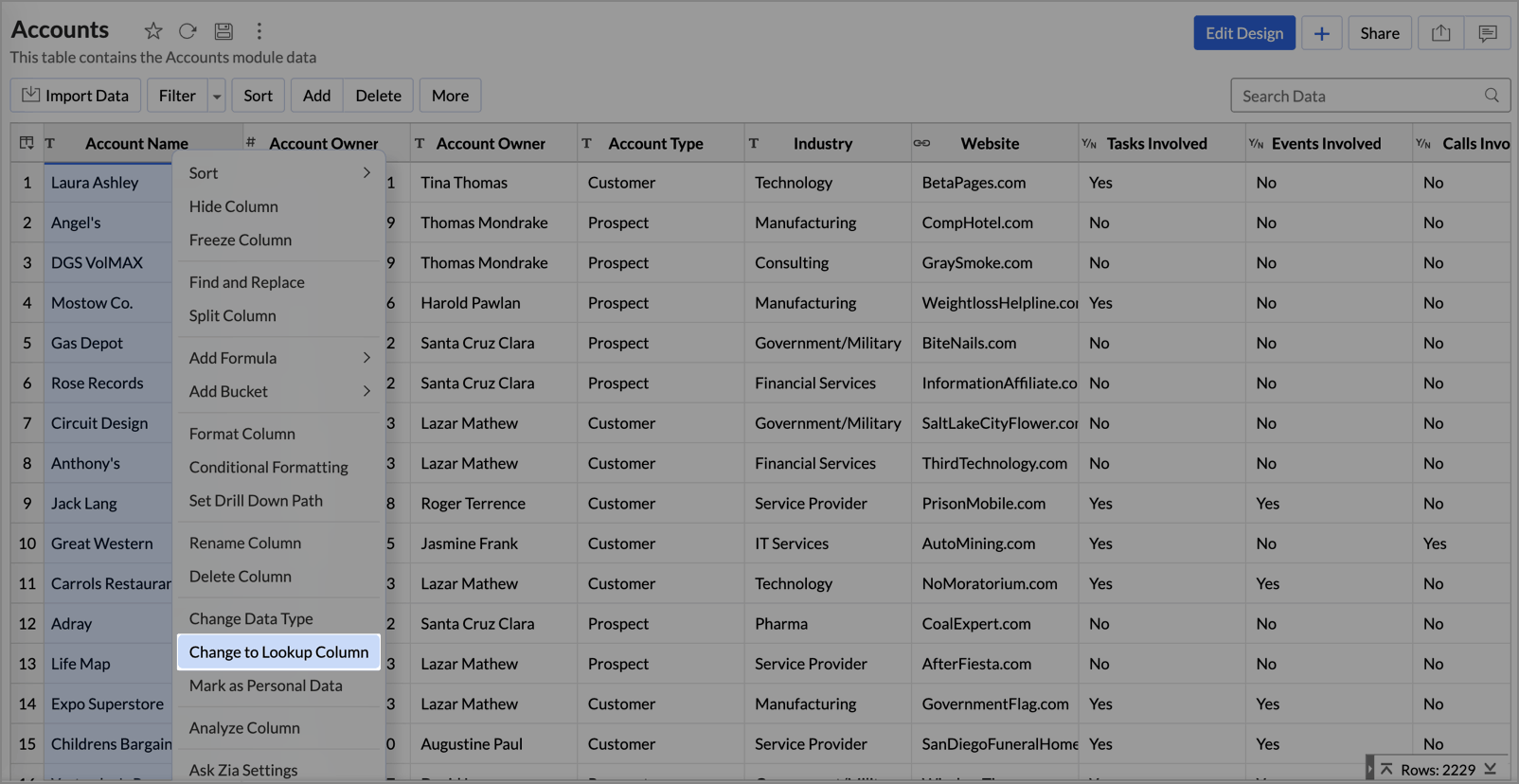 Accounts | Id, Account Owner, Rating, Account Name, Phone, Fax, Parent Account, Website, Ticker Symbol, Account Type, Ownership, Industry, Employees, Annual Revenue, SIC Code, Created By, Modified By, Created Time, Modified Time, Billing Street, Shipping Street, Billing City, Shipping City, Billing State, Shipping State, Billing Code, Shipping Code, Billing Country, Shipping Country, Description, Last Activity Time, Account Number, Account Site, Tag, Change Log Time, Locked, Last Enriched Time, Enrich Status, Account Owner Name |