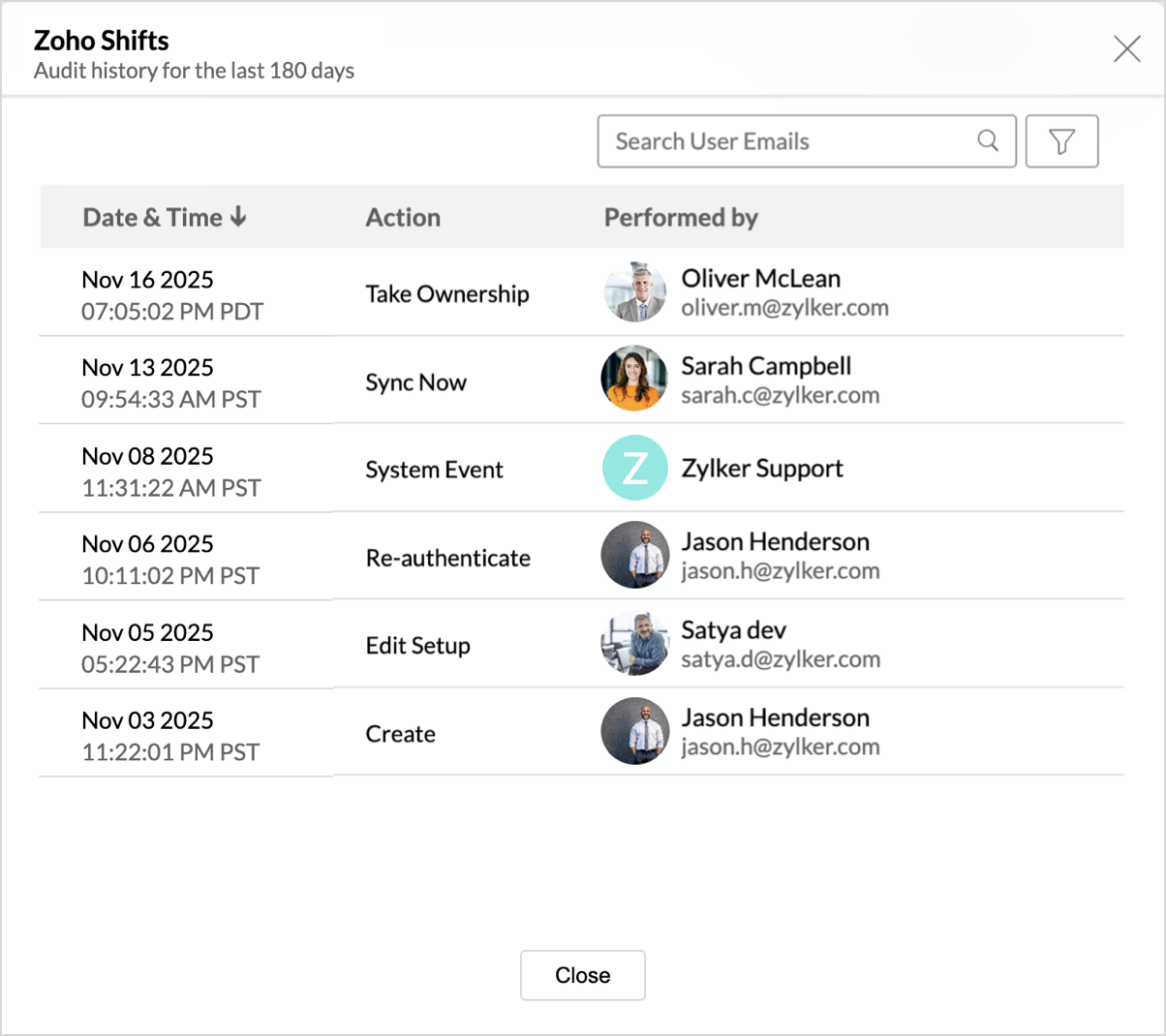 Zoho Analytics logs all the user activities and system events within the Zoho Shifts workspace. The following actions that are logged in Zoho Analytics,