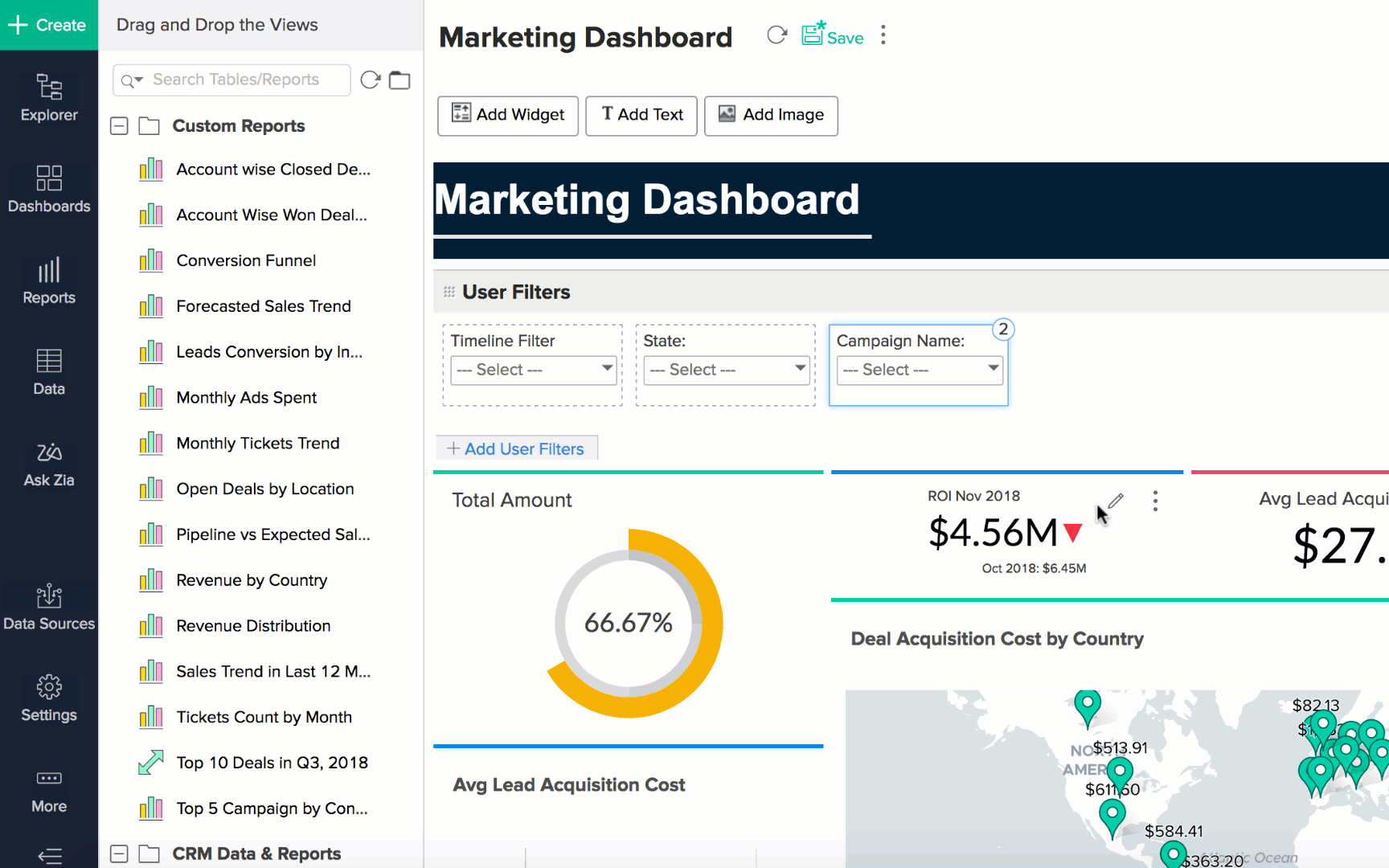 Zoho Analytics allows you to add reports to your dashboard easily with a drag and drop interface.
