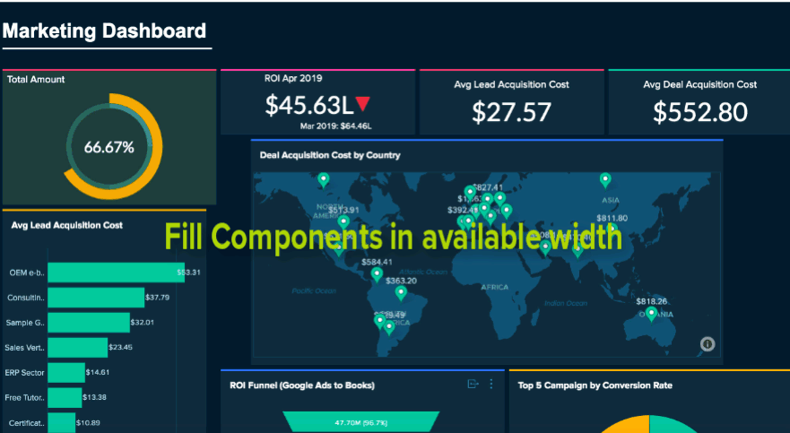Zoho Analytics provides a flexible m x n layout Dashboard. You can organize the dashboard in any way. You can simply drag and drop the components in edit mode of the dashboard.