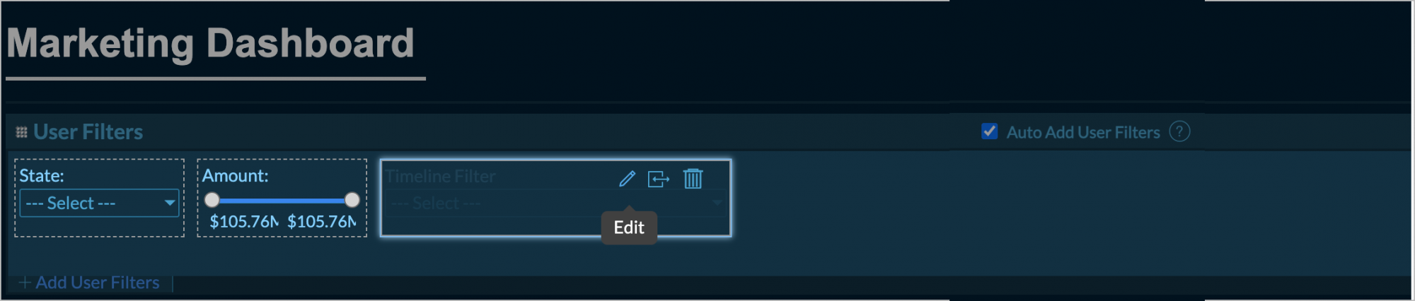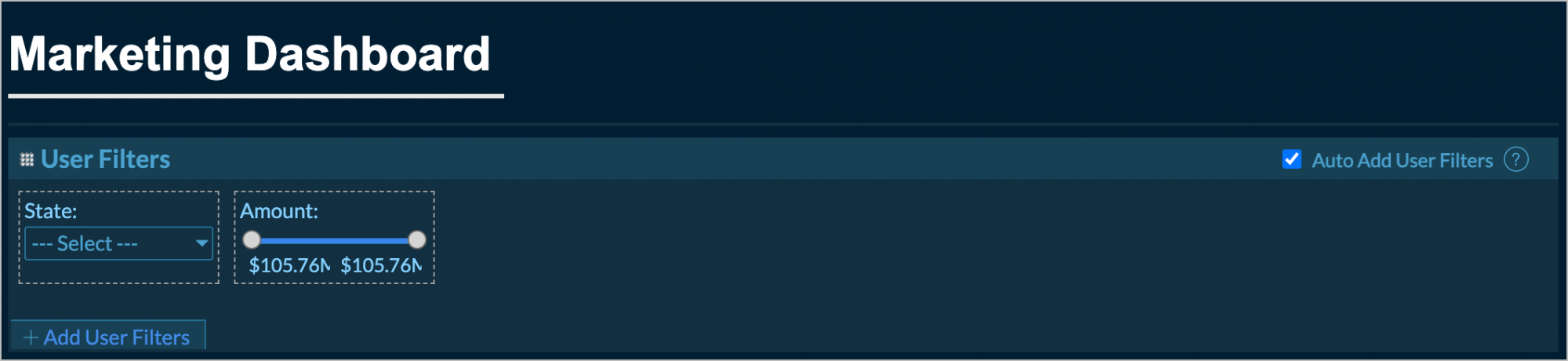 - Add reports with user filters to the dashboard. User filters in these reports will be automatically added to the dashboard.