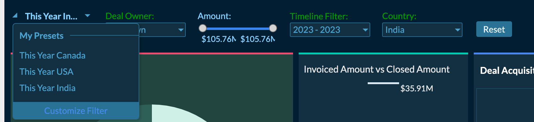 - Repeat the above in case you need multiple preset filters. In the screenshots shown, one preset filter can be this year data for India, the next preset filter can be last year data for the USA, etc.