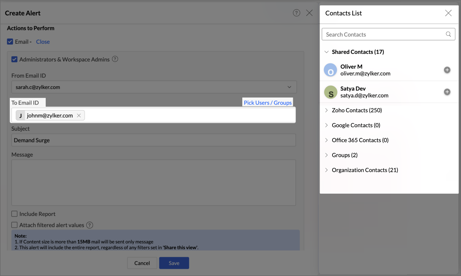- Use the Contact Picker - Click "Pick Users / Groups" next to the To Email ID field. A slide-in panel opens showing contact sources in collapsible categories: Shared Contacts, Zoho Contacts, Google Contacts, Office 365 Contacts, Groups, and Organization Contacts. Each category shows the count of available items.