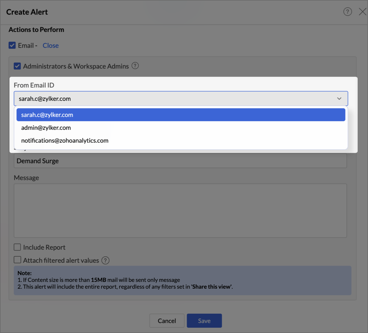 - Select the From Email ID, the address Zoho Analytics will use to send the alert: