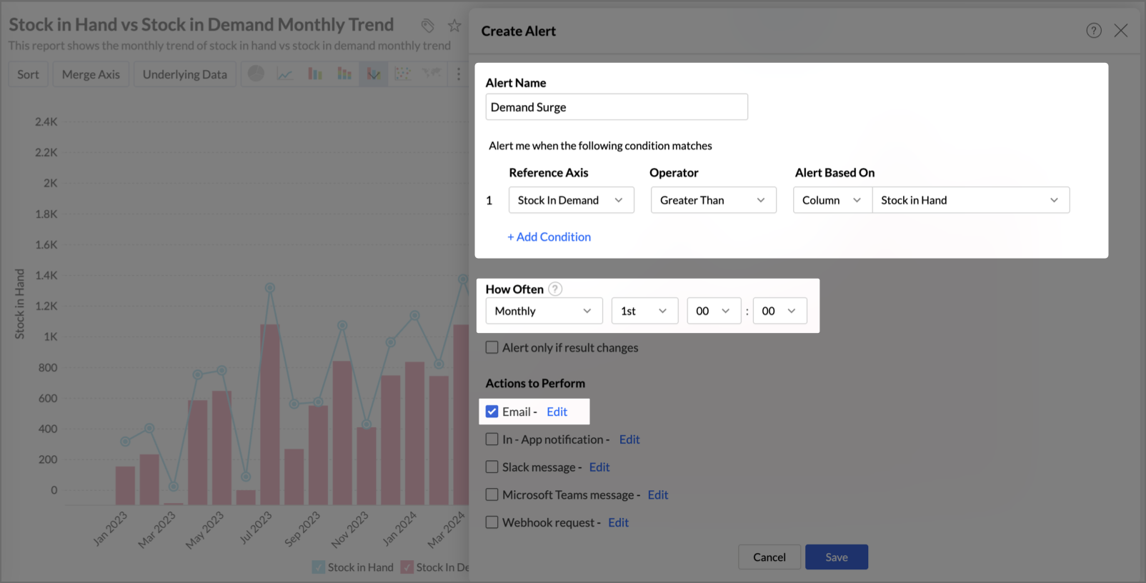 Zoho Analytics enables you to create alerts based on anomalies detected in a specific view.