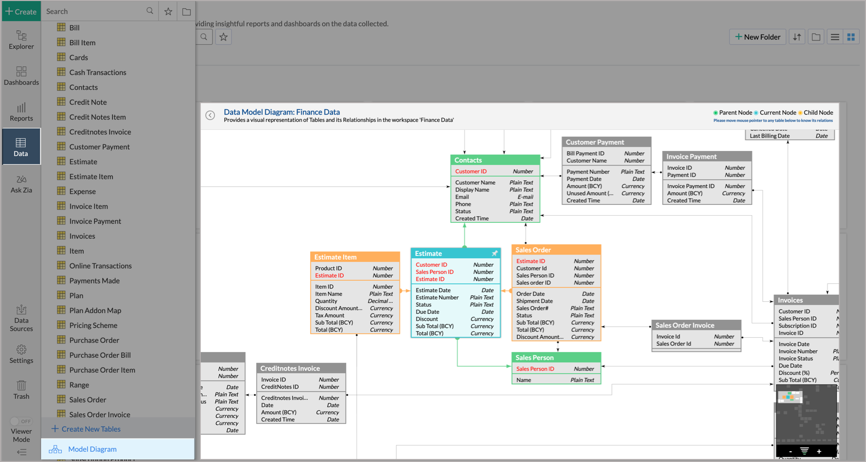 Joining Tables with Auto-Join: Zoho Analytics automatically identifies and joins related tables in a workspace using a lookup relation. You will notice all the related tables in a workspace listed in the left-menu while creating reports and you can also see the relationship between different tables in a workspace from the Model Diagram. Read more.