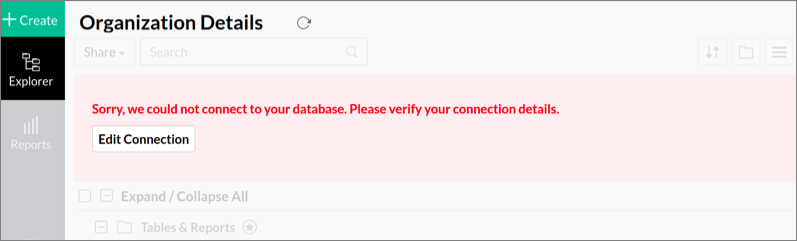 When you delete or rename a database in DigitalOcean PostgreSQL, Zoho Analytics loses its connectivity with DigitalOcean PostgreSQL. After that, a warning message, as shown below, would be displayed. This error message will also be displayed if there are any connectivity issues or if your DigitalOcean PostgreSQL credentials have expired.