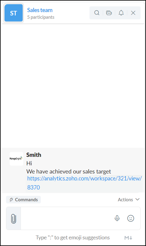 An alert message will be displayed on the corresponding platform when the data alert conditions are met. In the above example, we have specified a webhook request to deliver the message to a Zoho Cliq (a popular chat application from Zoho) channel when the data alert conditions are met.