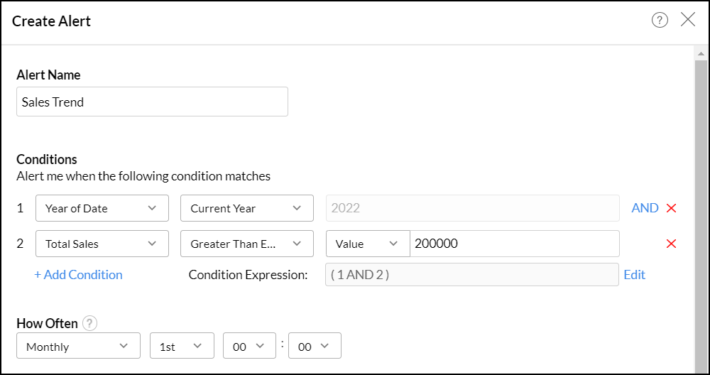 - In the dialog that appears, provide a name for the alert and create conditions based on which the alert must be triggered. Click here to learn about creating conditions.