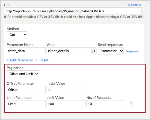 - Offset and Limit: This option allows you to import a large dataset into Zoho Analytics in batches, using the batch size of each batch and the starting position.To use the option, provide the following details: