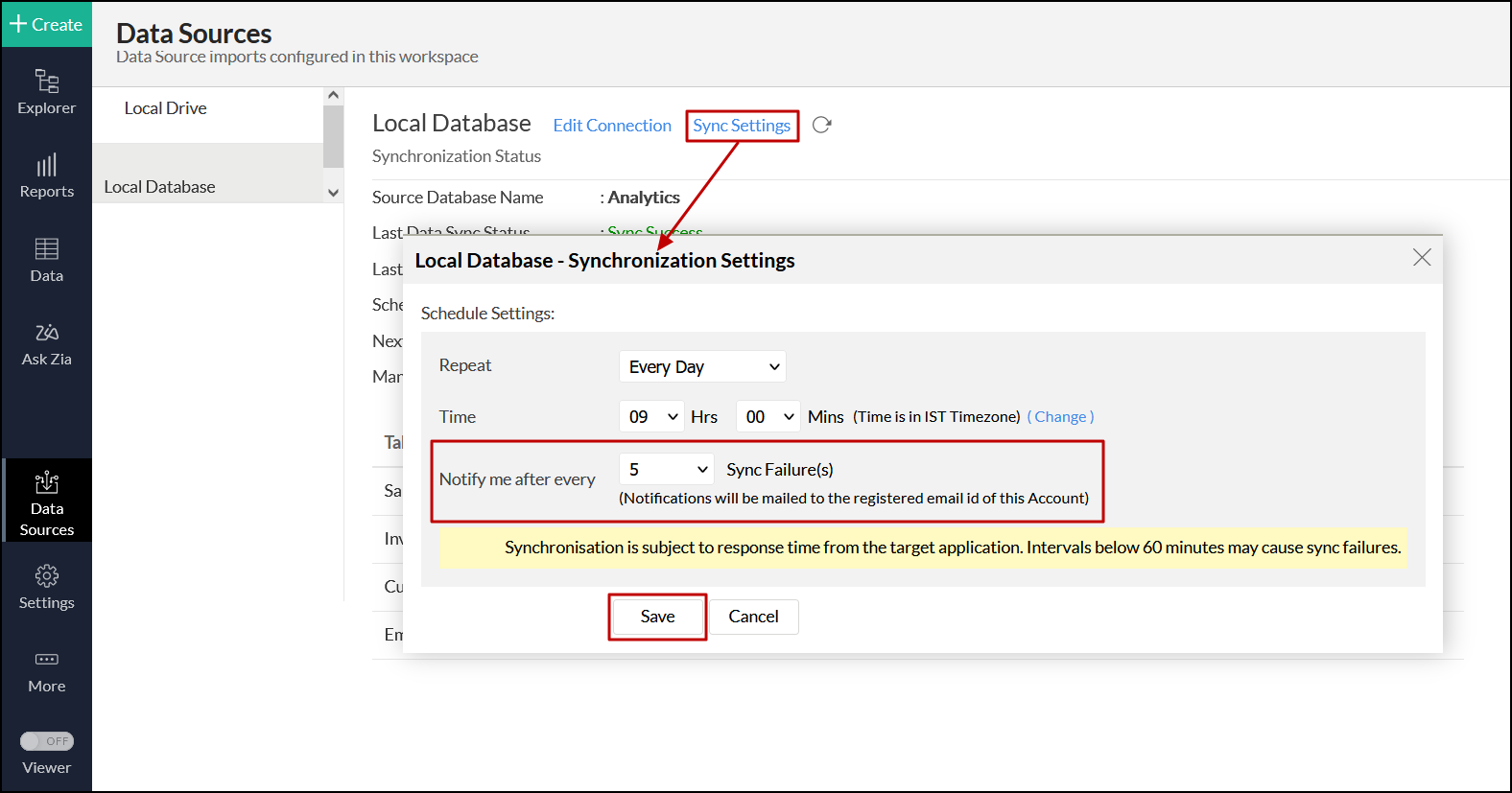 Zoho Analytics allows you to get notified of consecutive import failures, while setting up data schedules. To do this,