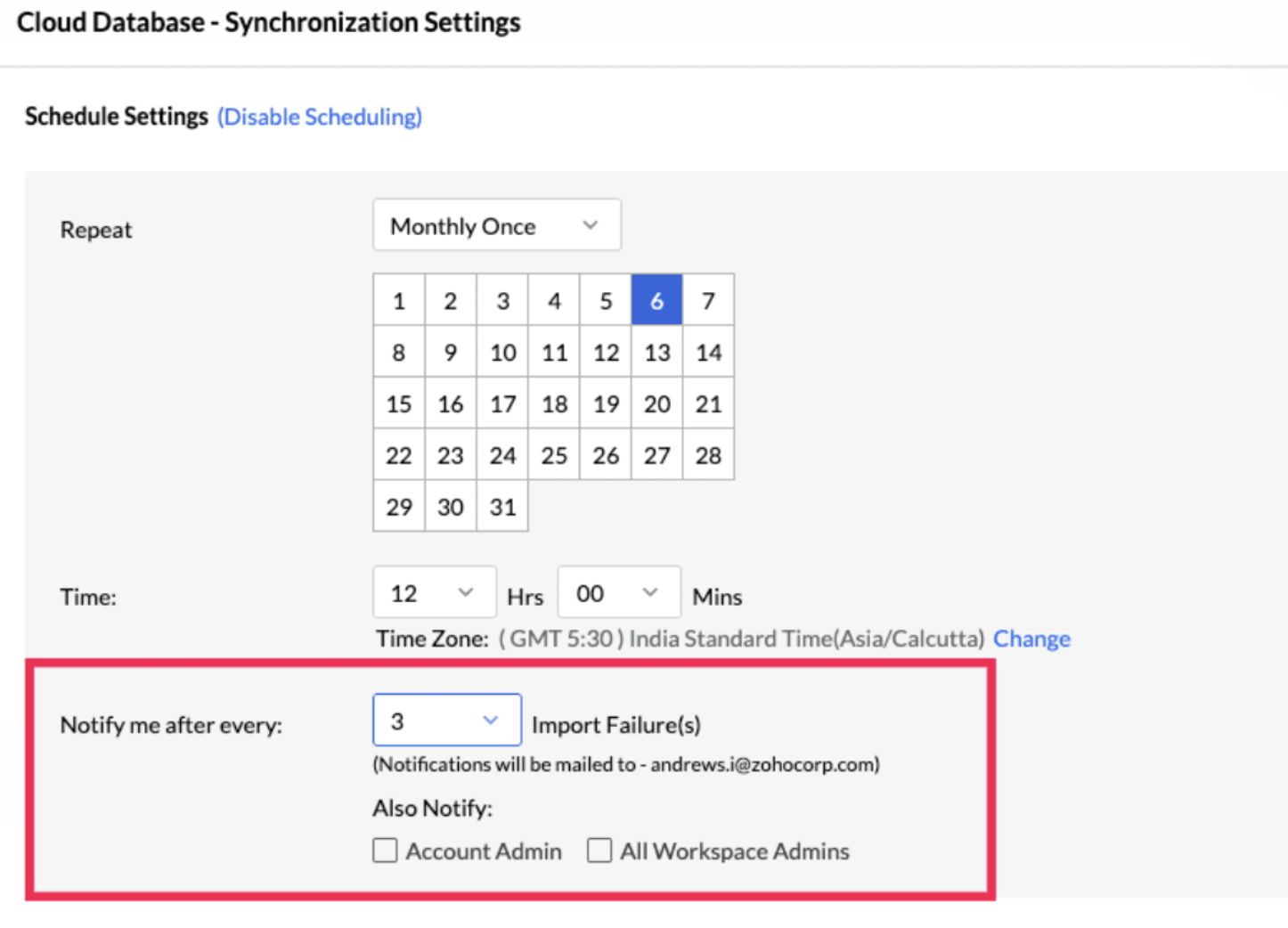 Zoho Analytics allows you to get notified of consecutive import failures, while setting up data schedules. To do this,