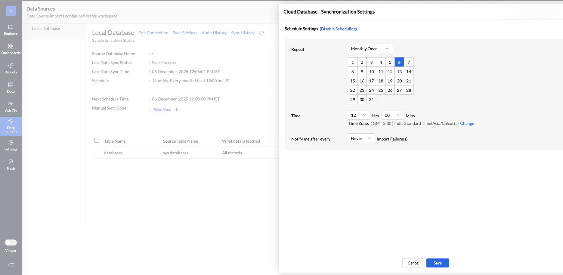 Zoho Analytics allows you to schedule the data import for any existing tables imported from the ODBC. Follow the steps below to do this.