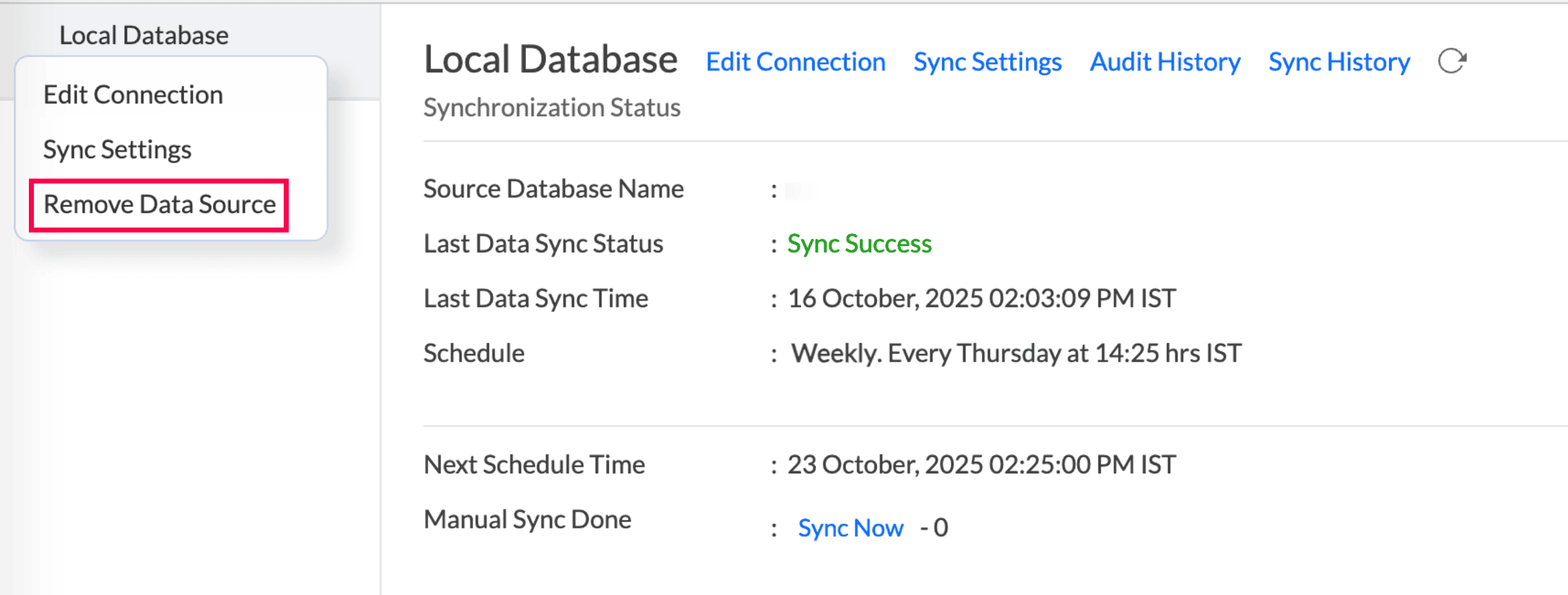 Click the Settings icon that appears on mouse over the data source's name, and select Remove Data Source.
