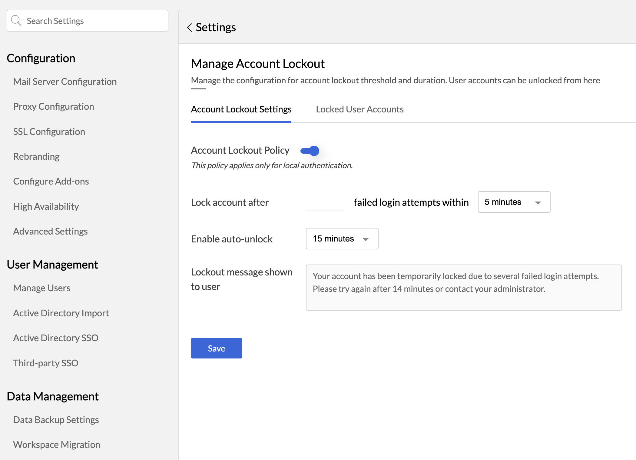 You can enable auto-unlock after a specified duration, and this policy is applicable only to users logging in with local authentication.This does not apply to users logging in via Active Directory or via Single Sign-on.