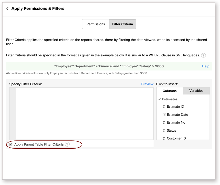 - In case you are specifying another shared filter criteria while sharing the report, then the parent table's filter criteria and report's filter criteria will be joined using AND option.
