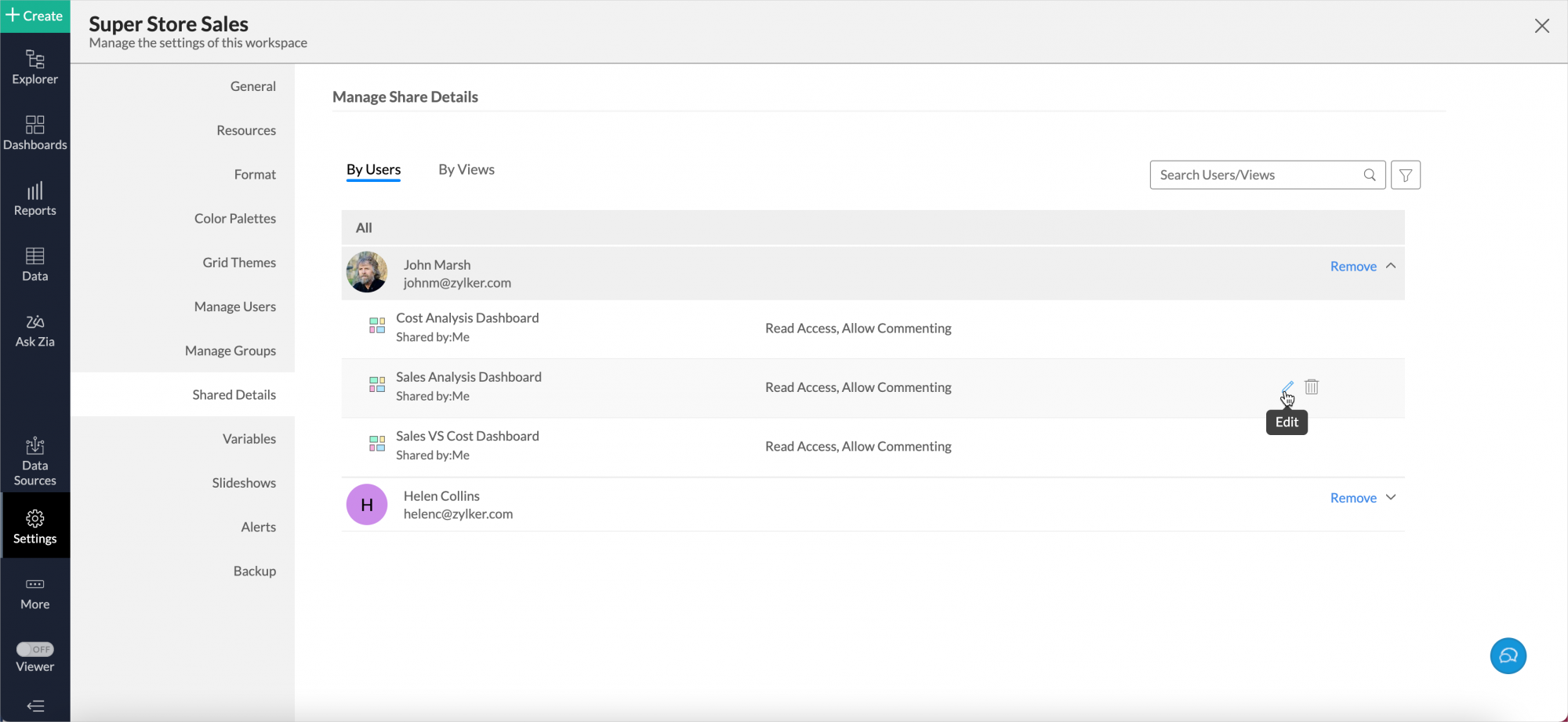 The Existing Shared Details dialog will open. You can choose to remove sharing or edit the permission by clicking the corresponding icons that appear when hovering the user.