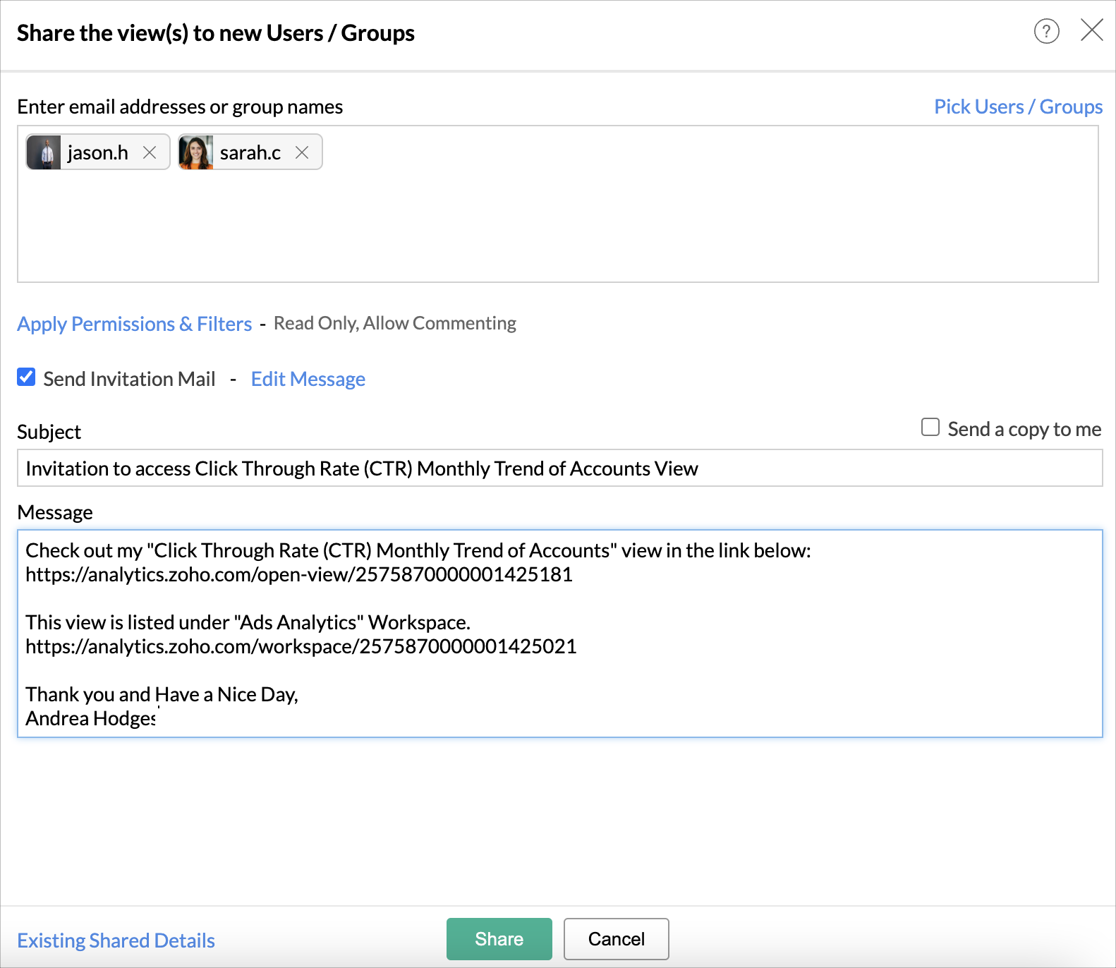 Yes, you can share view to your contacts. Click Add Users From link. The Contacts dialog will open, listing your Zoho Contacts, Google Contacts, and Shared Contacts.