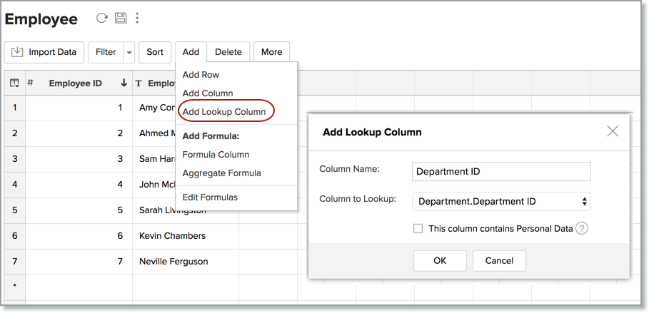 If your Zoho Analytics workspace has more than one table, you can start creating a lookup column.