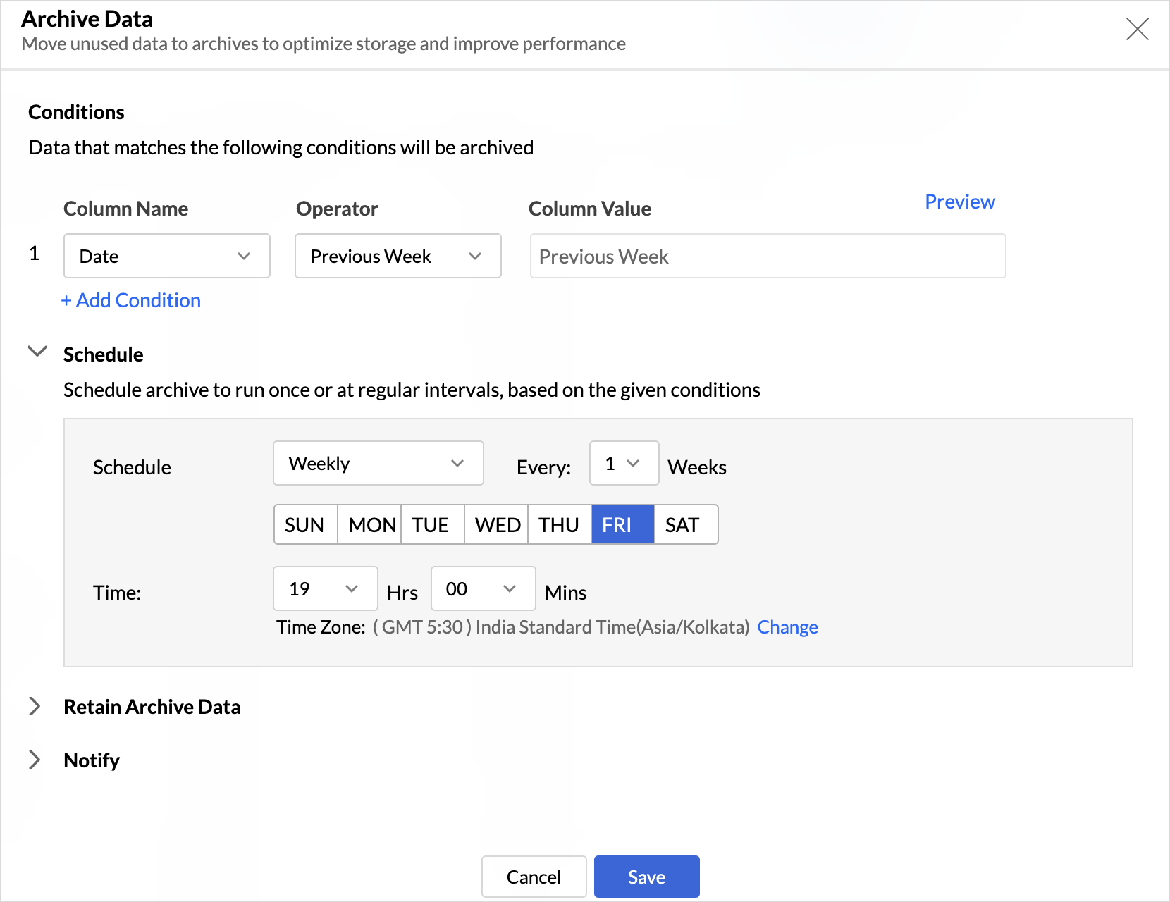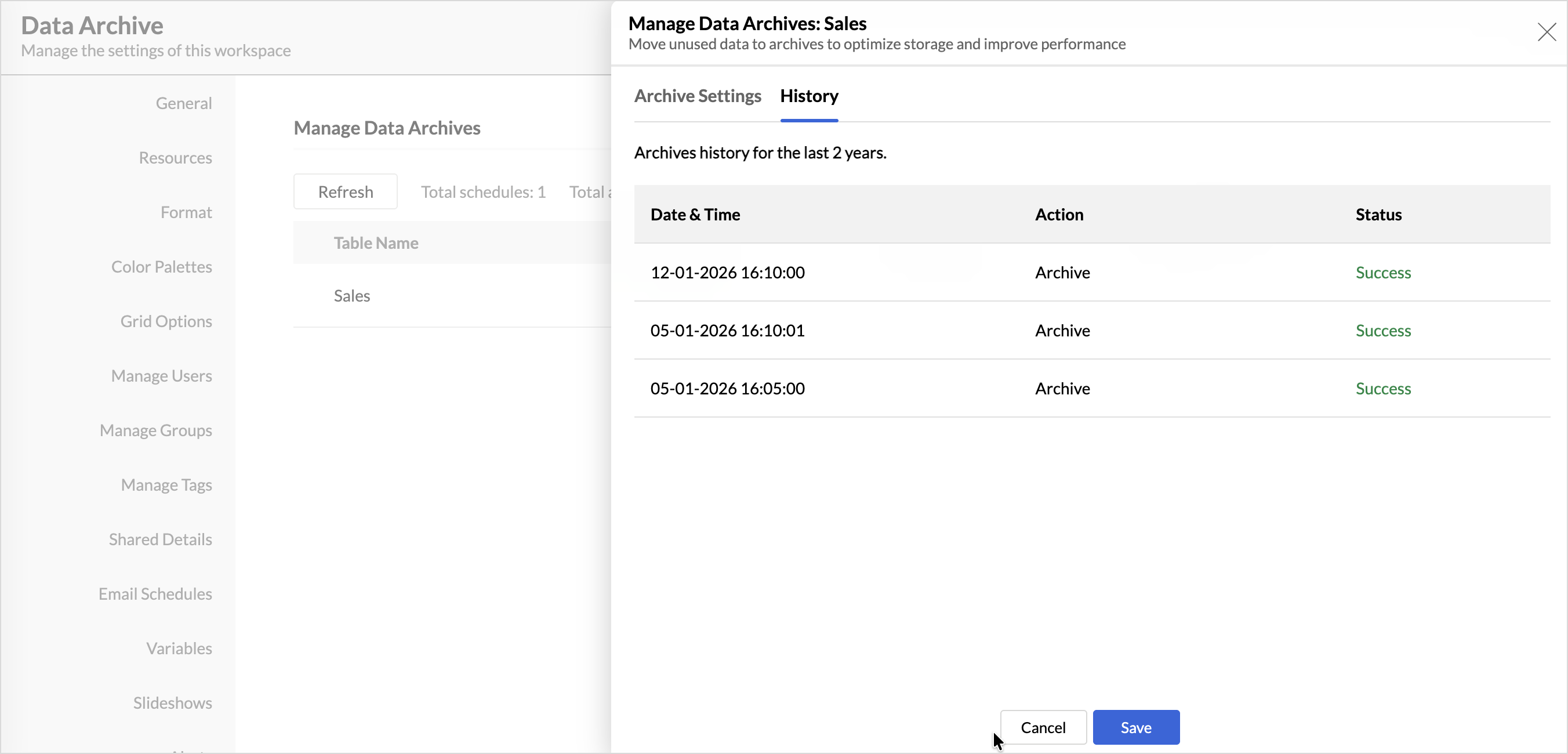 Once you have configured the above settings, Click Save. Data will be archived at the scheduled interval.
