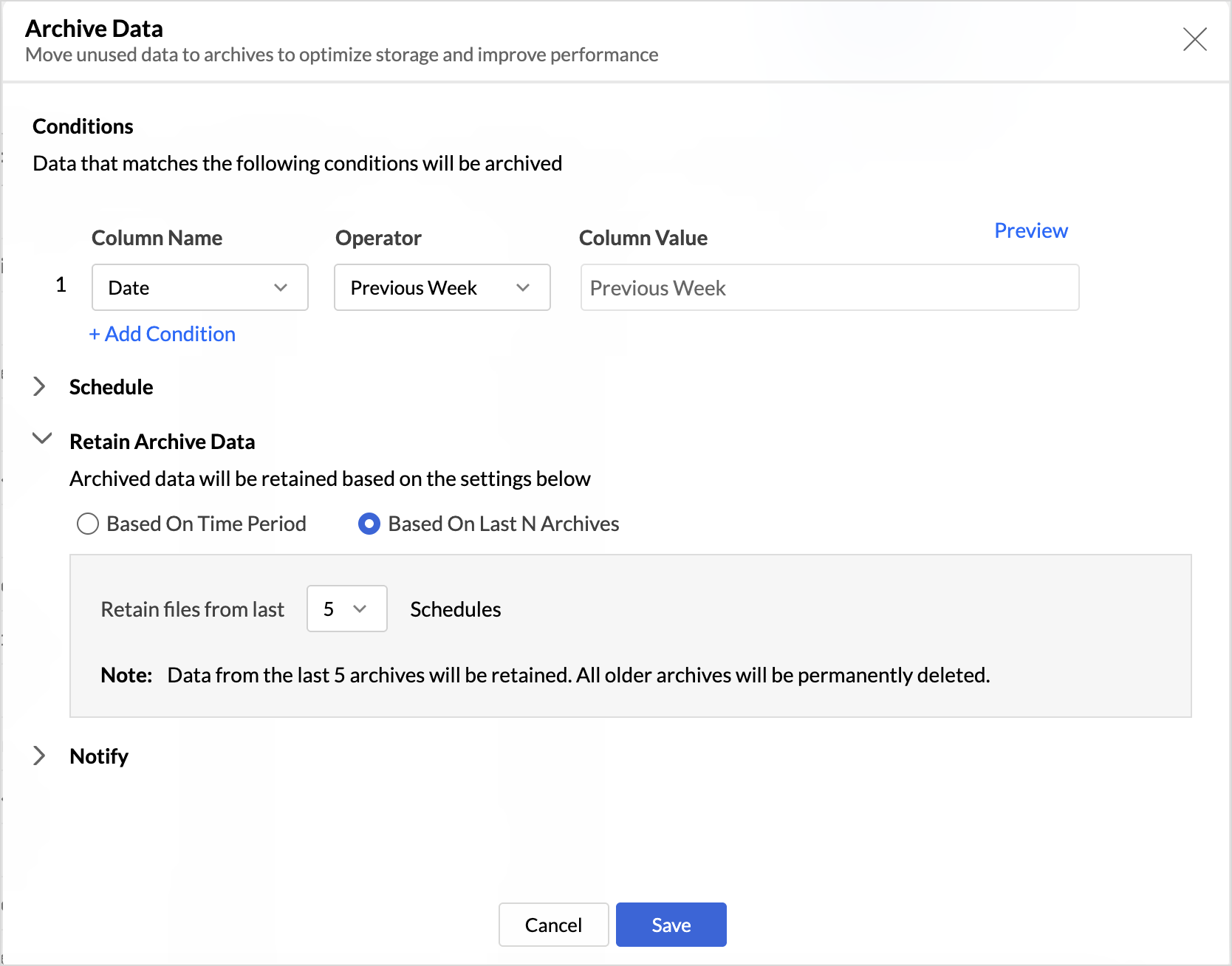 The Notify option helps administrators stay informed about the status of archive actions. When enabled, notifications are sent for both successful and failed archive executions.
