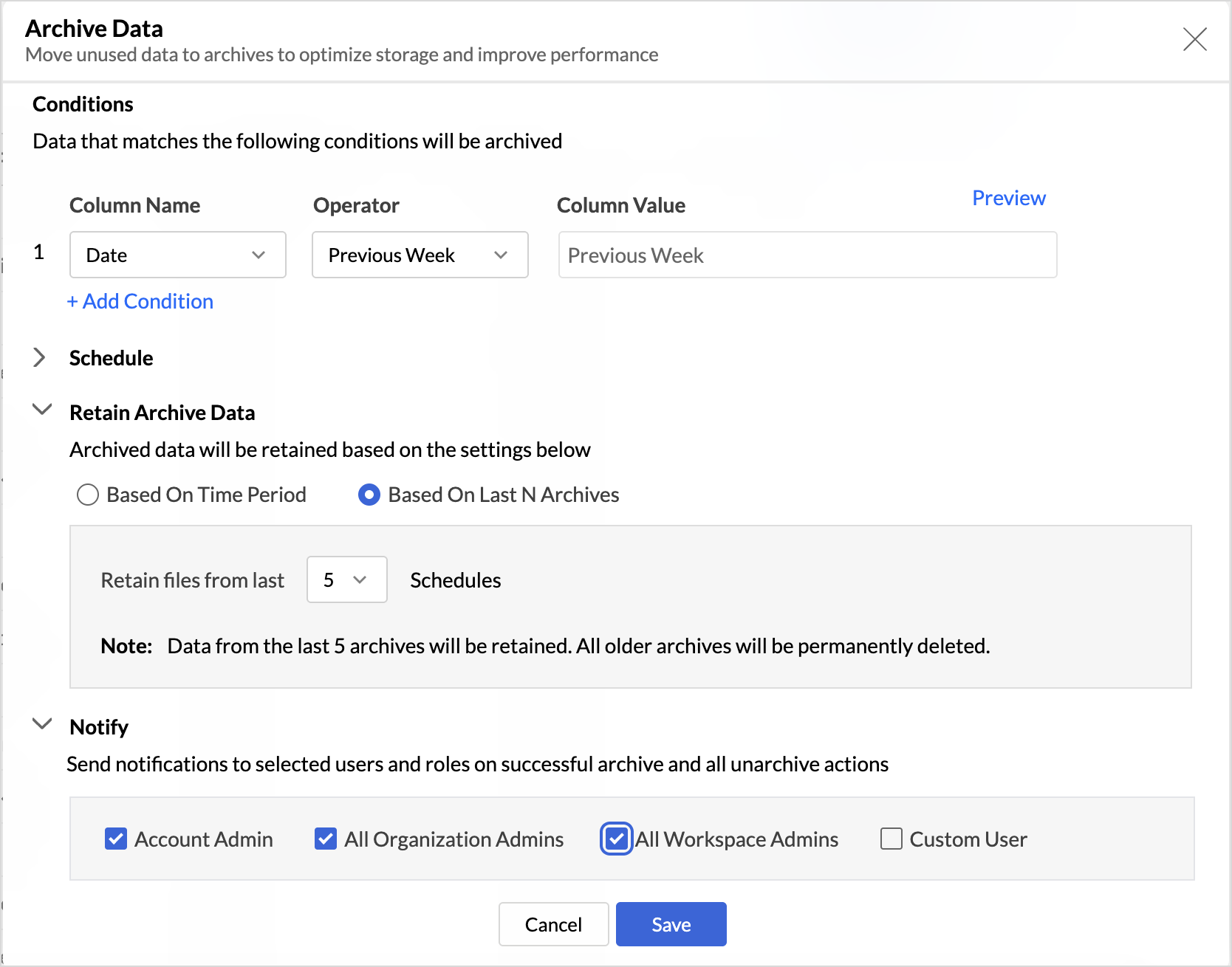 Users with administrator privileges like account admin, org admin, workspace admin can archive data.