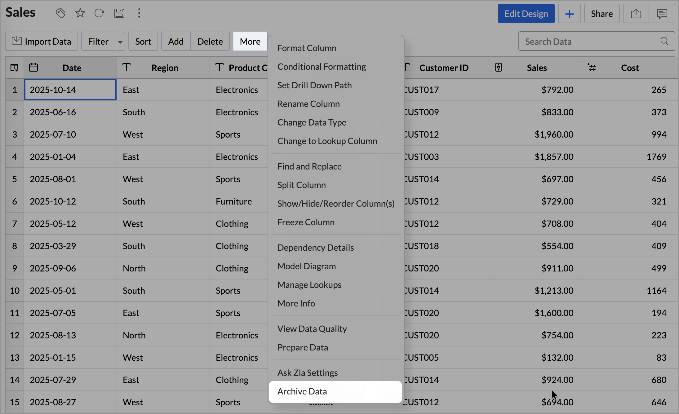 Use the Unarchive option to restore previously archived data back into Zoho Analytics when it is required for analysis or reporting. Once unarchived, the data is moved back to the original table and becomes fully available for creating reports and dashboards.