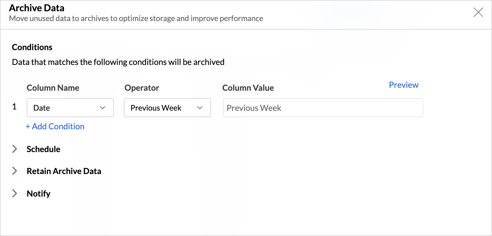 - Under Conditions, define the rules that determine the records that should be archived.