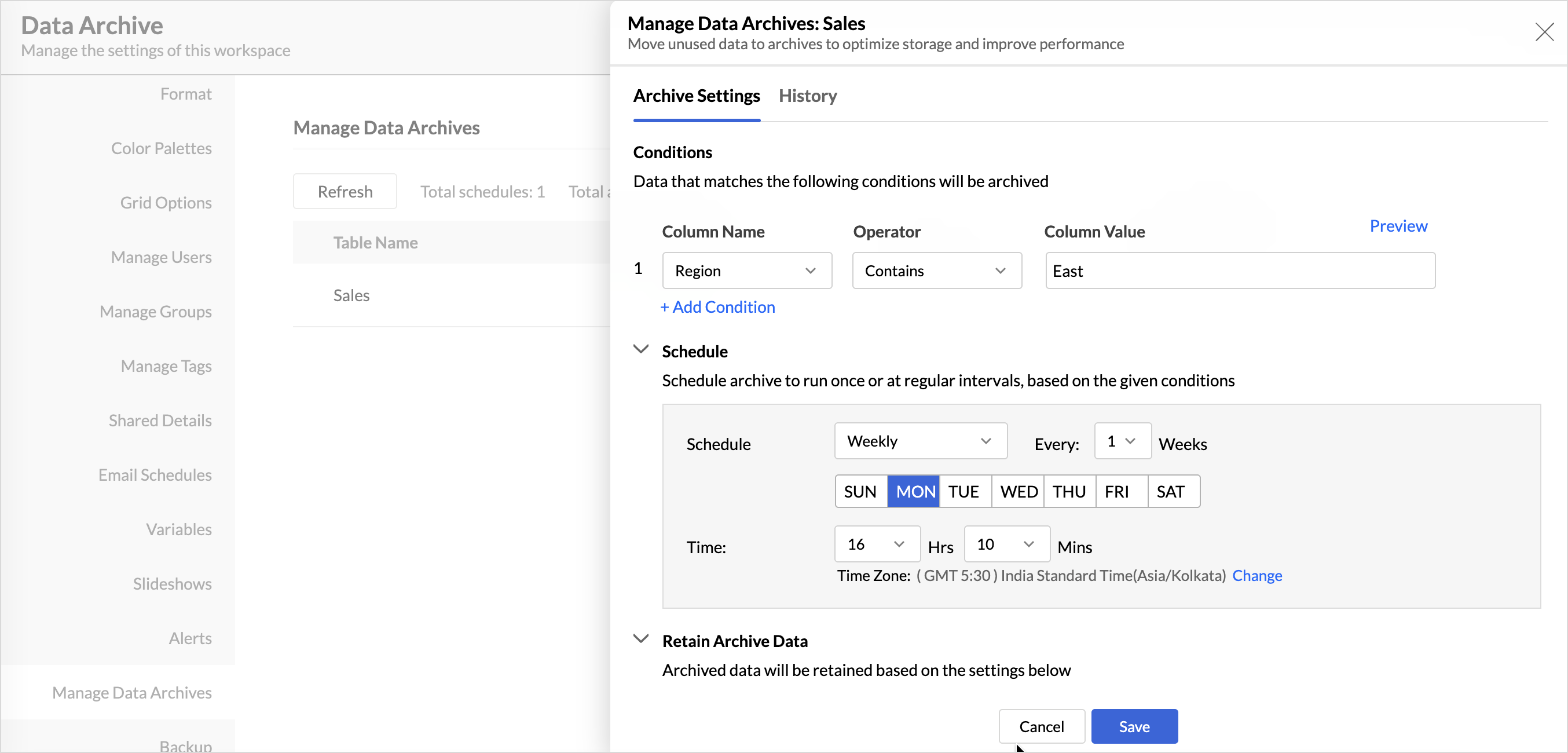 Manage archive settings allows you to monitor all archive activities and manage existing archive configurations. From this section, you can review archive schedules, track execution status, and modify conditions, retention policies, or notification settings as required.