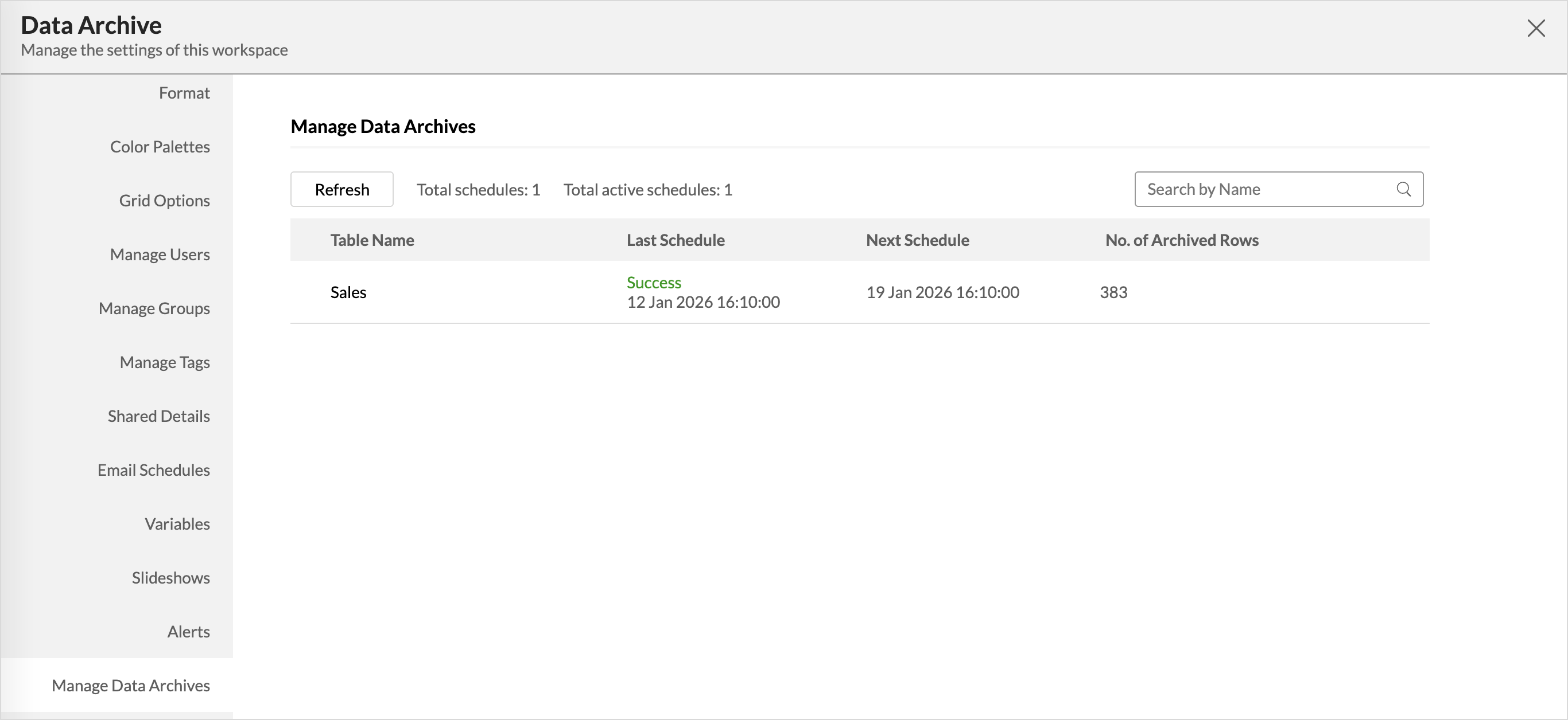 - All the Archive Schedules configured within a workspaces are listed along with the Table Name, Last Schedule and Next Schedule and the number of rows archived.