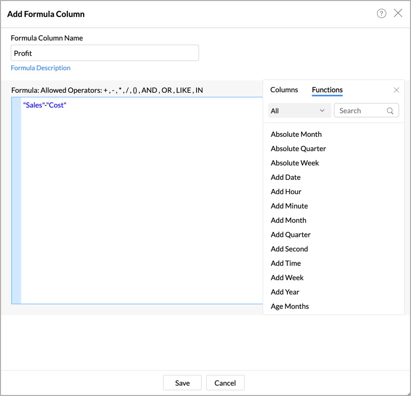 Zoho Analytics allows you to define powerful formulas and derive custom metrics to meet your specific reporting requirements. This enables you to perform from simple calculations such as addition and subtraction to a complex calculations using built-in functions. The output of the formula adds a new column in the tabular view as well as add it as formula column in the underlying data table.