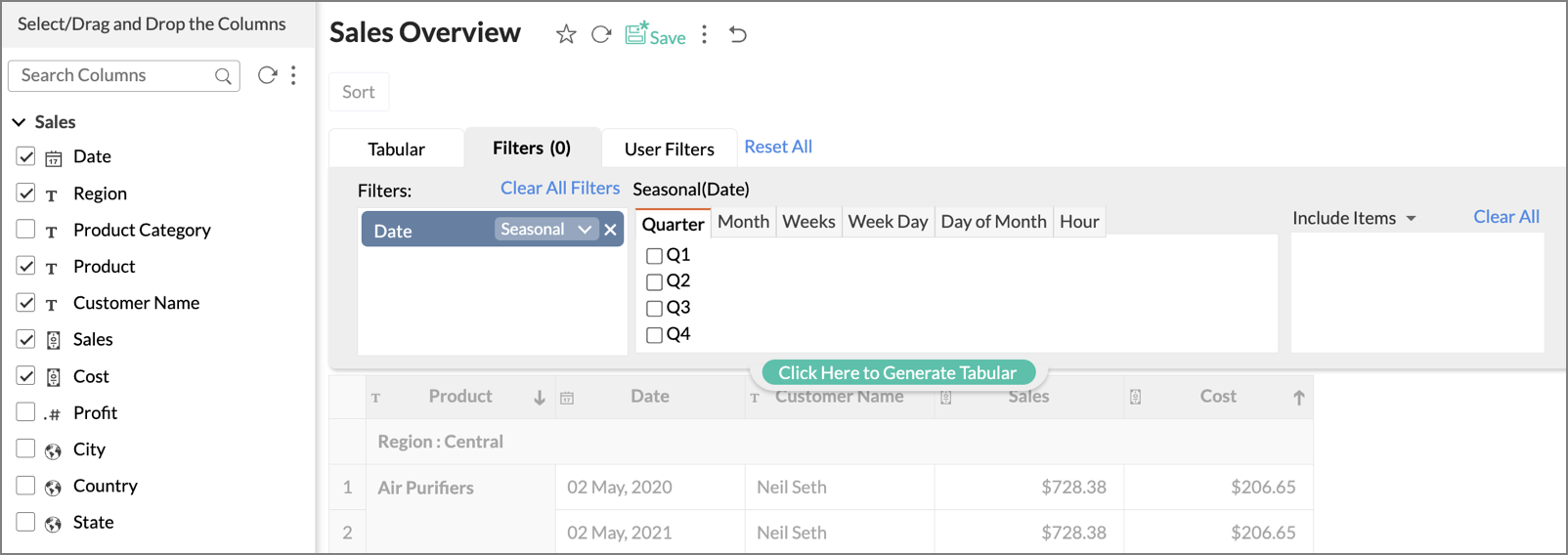 Here, we will filter the created Sales Overview Tabular View to display only the data for 2019, 2020, and 2021. To do this: