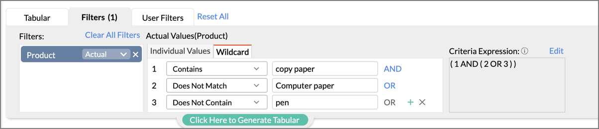 By default, conditions from last to first will be grouped. i.e., when you have three conditions, the third and the second will be joined, and the result will then be joined with the first. You can change the default grouping of the conditions if needed. To modify, click the Edit link next to the Criteria Expression. Modify the filter criteria as required, and then click OK.