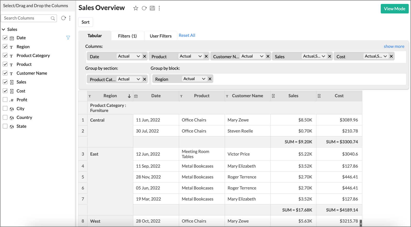 A Tabular View as the name implies is a simple table-like report, that can be created with an intuitive drag and drop interface, over your data tables. With Tabular View, you can easily summarize, structure, group, filter, and customize data the way you want.