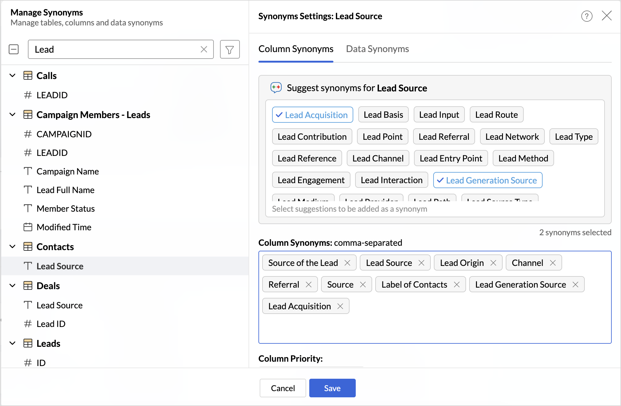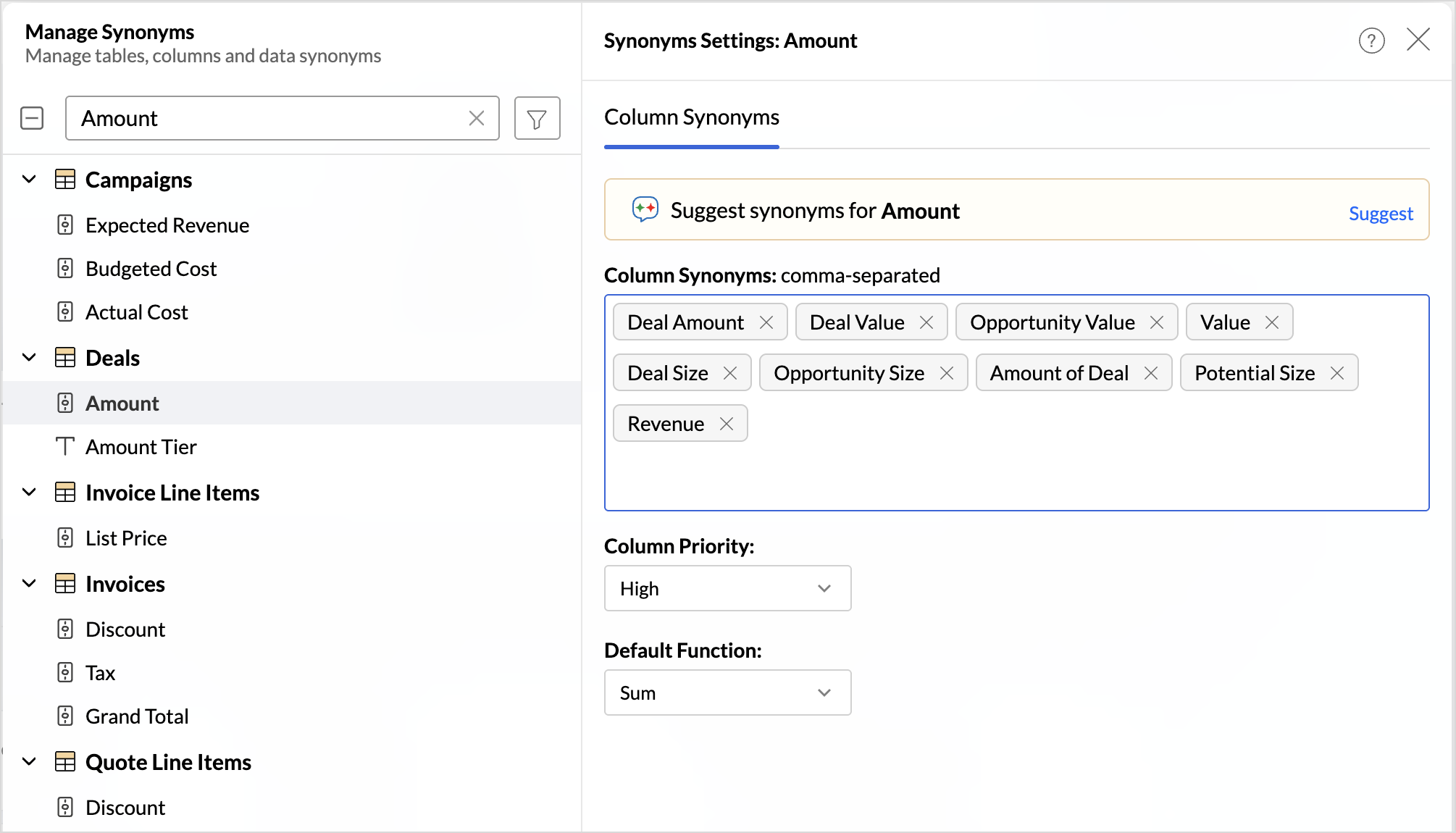 Click the Suggest synonyms option. Synonyms for the column name will be listed. Select the needed terms to add as column synonym.