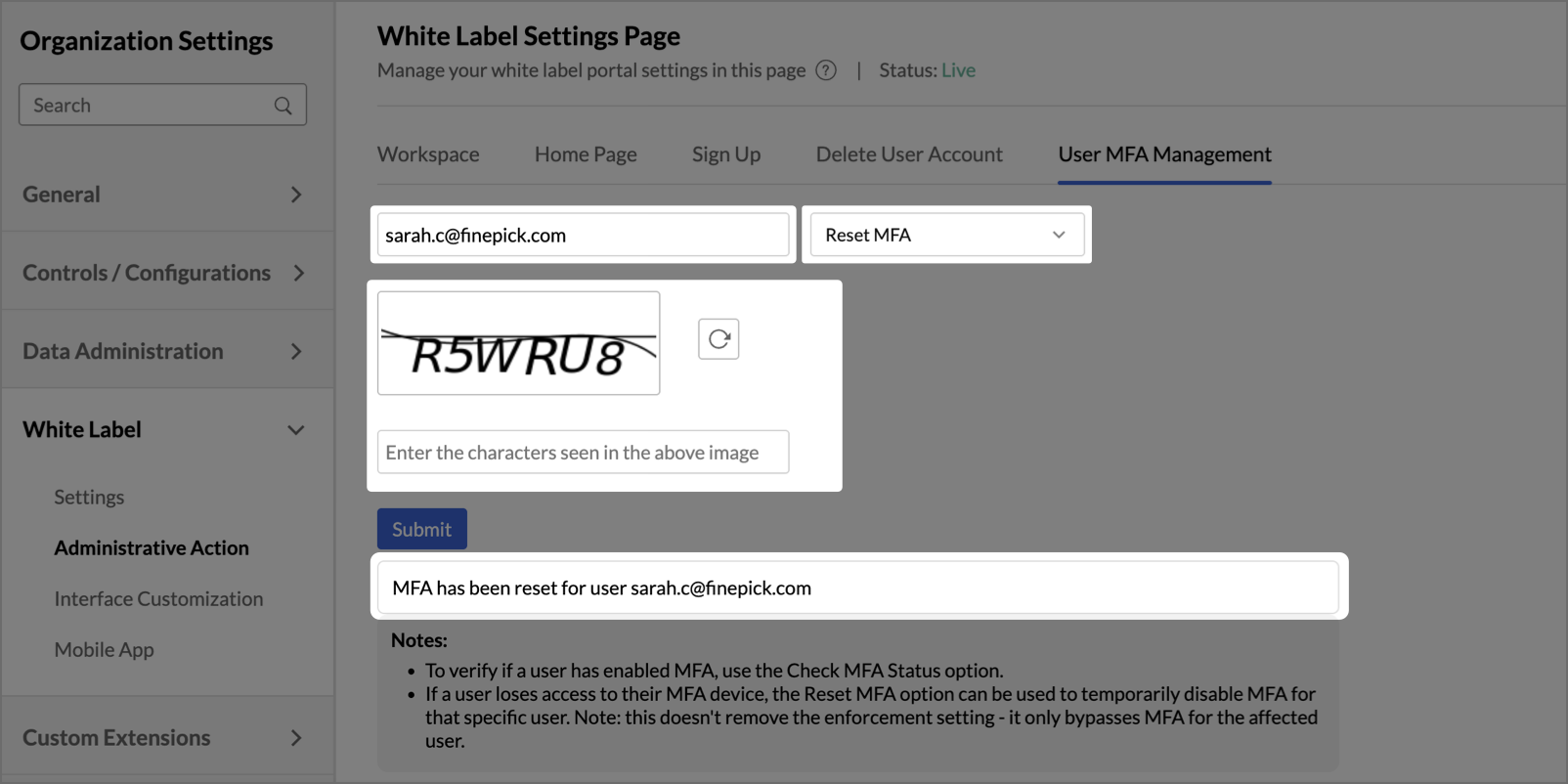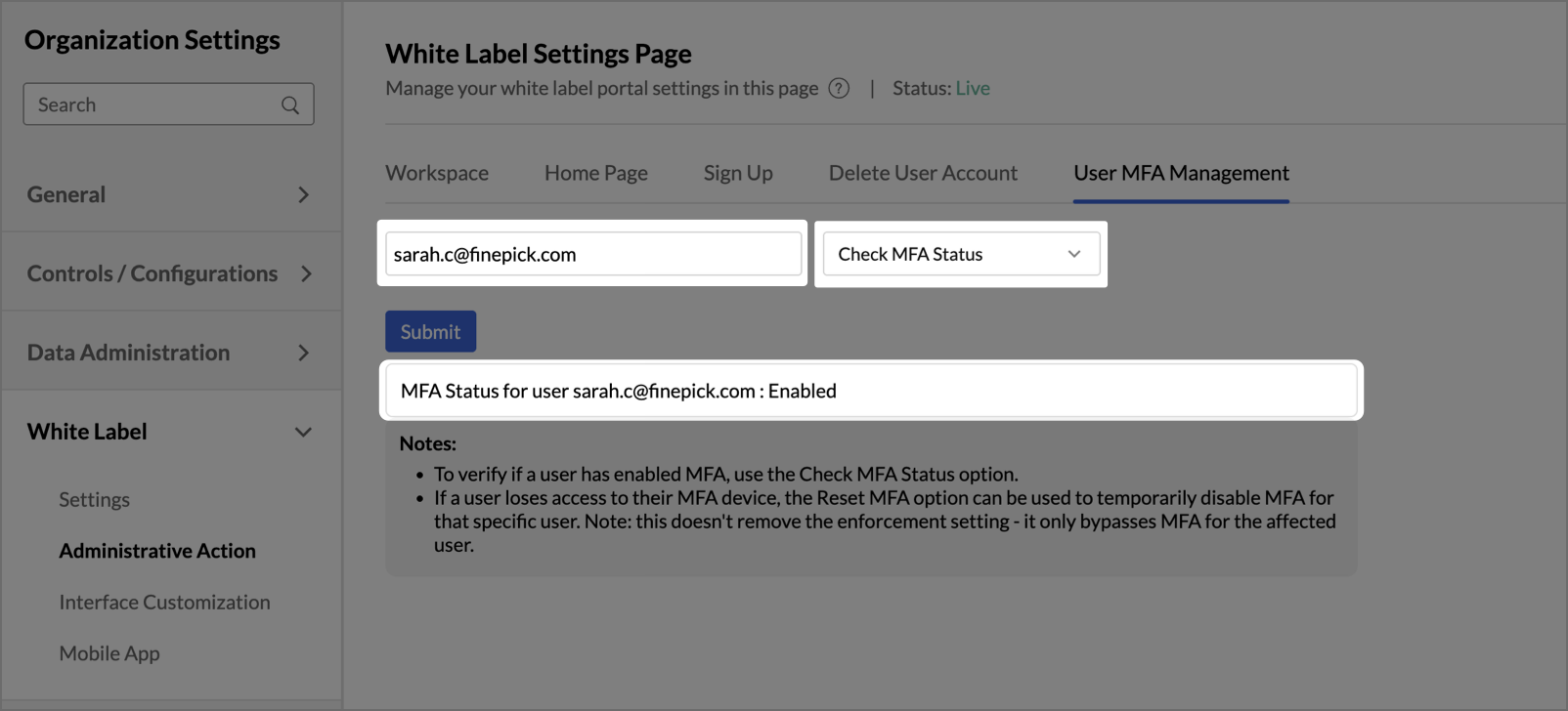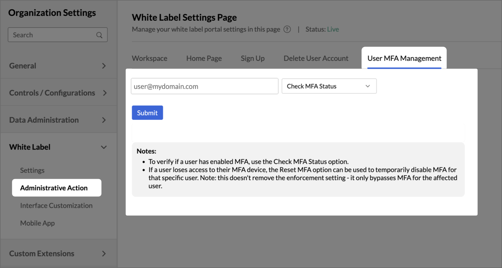 Admins can manage Multi-Factor Authentication at an individual user level from the User MFA Management tab under Administrative Action. Use the user's email address to look up and manage their MFA configuration.