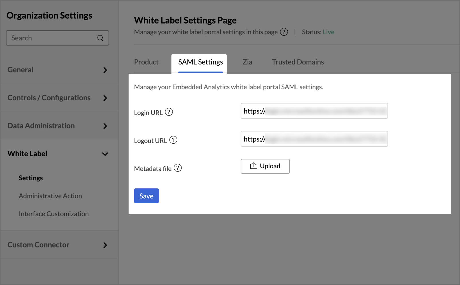 Configure and manage the SAML settings of your embedded analytics white label portal.