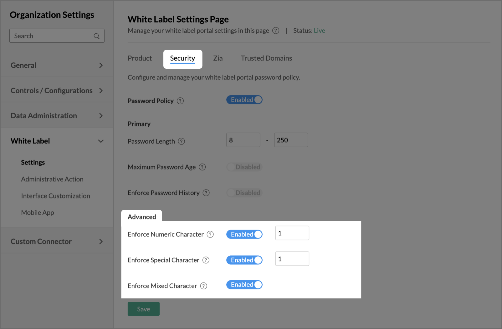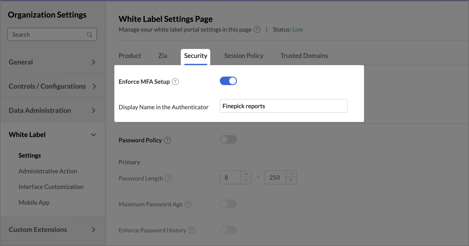 - Password Length: Specify the minimum and maximum length of the password that needs to be used for your white label portal.