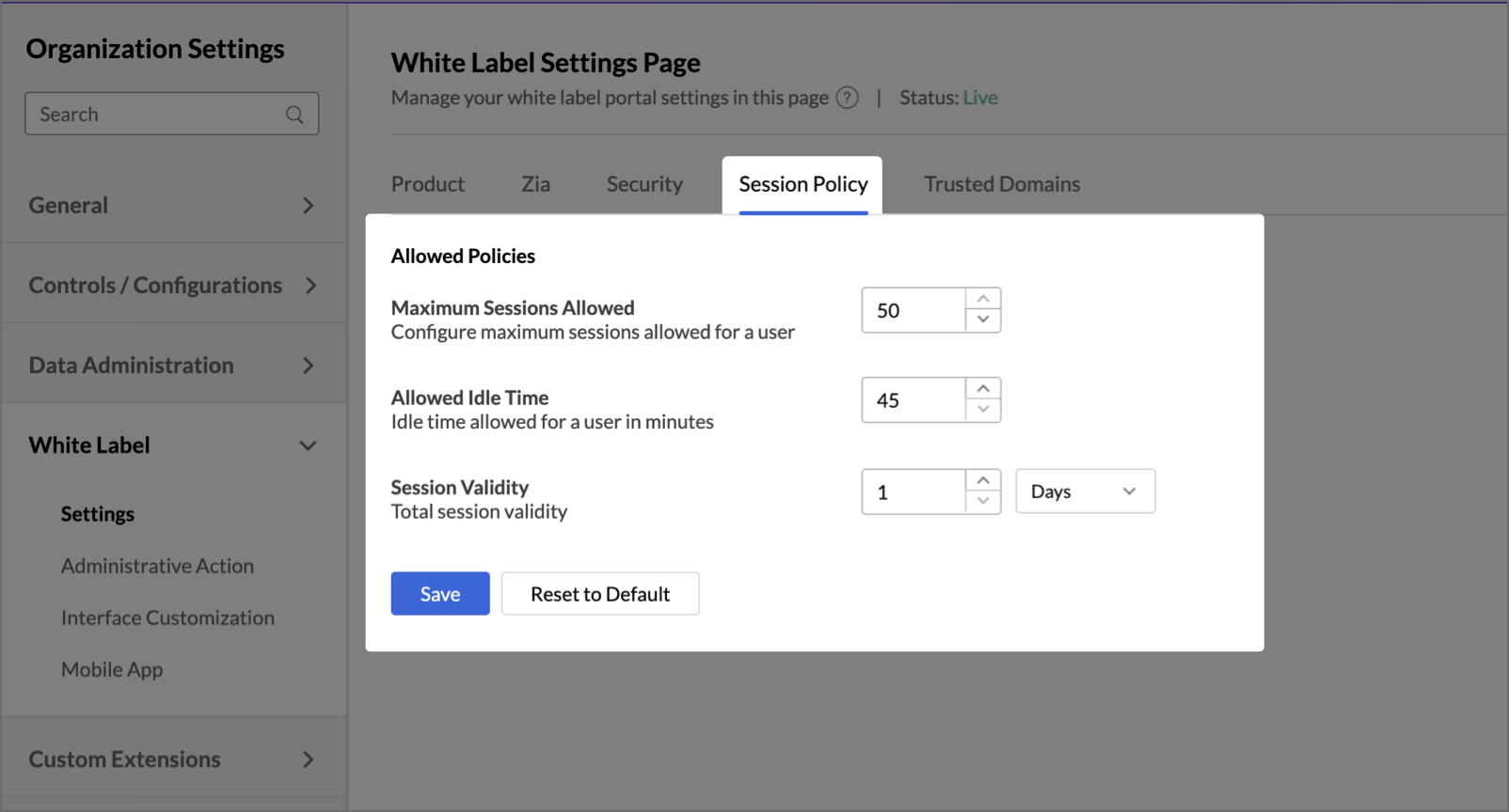 Click Reset to Default to restore all session policy settings to their system default values. This takes effect immediately.