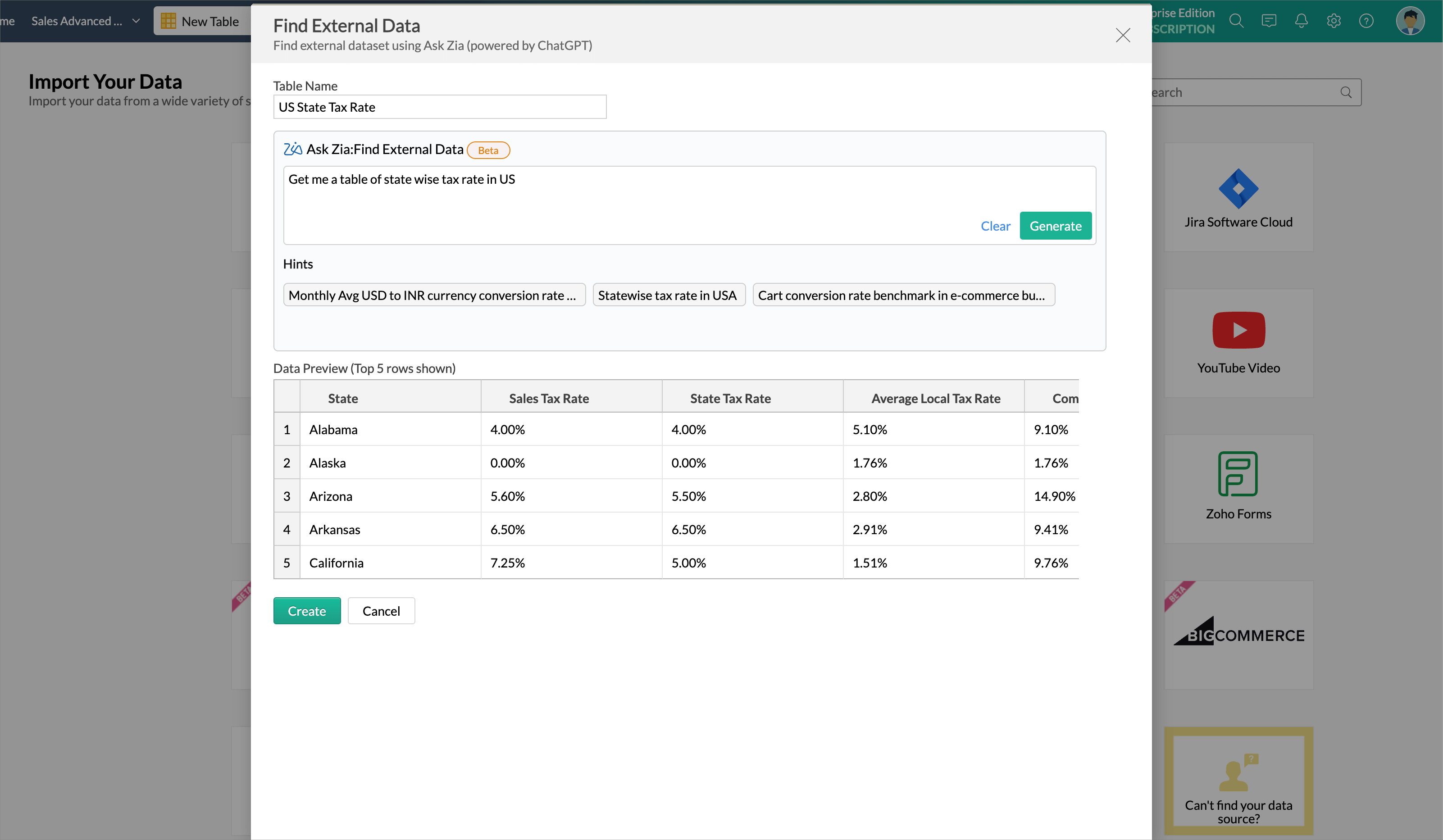 - Select Find External dataset using Ask Zia from the listed data sources.
