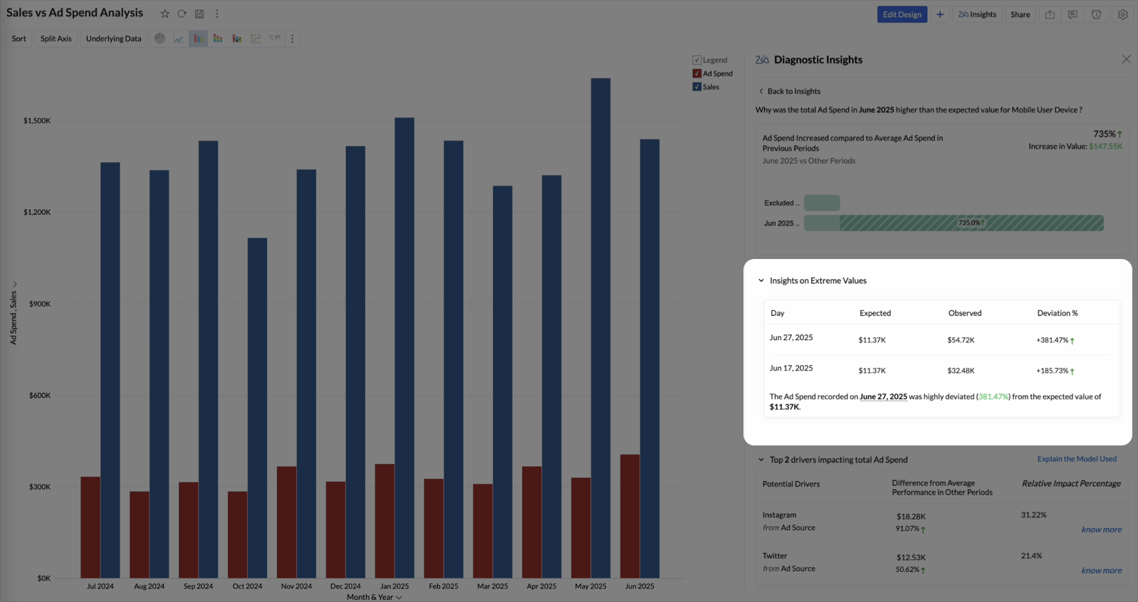 In diagnostic analysis, Extreme Value Insights highlight instances where the key driver values are exceptionally high or low (outliers) and have a significant impact on the target metric.