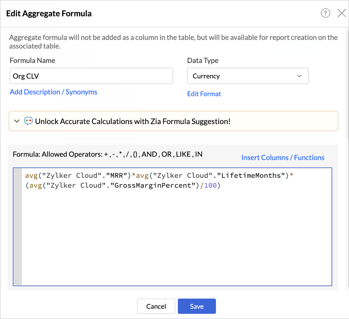 In Zoho Analytics, this CLV is created as an aggregate formula as shown below, making it easy to compute and reuse across reports and dashboards.